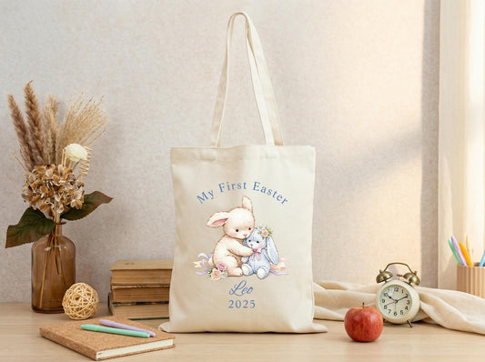 Canvas Tote Bag Bunny Print, Personalized Name Year, 2026 Spring Easter Basket Tote, First Easter Keepsake, Seasonal Gift Idea