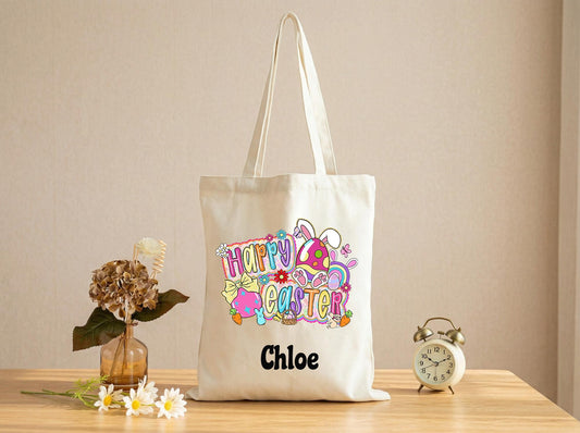 Canvas Tote Bag Personalized Name Happy Easter Design,Sweet Gift From Parents To Kids,Egg Hunt Keepsake Bag,Custom Easter Basket Alternative